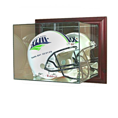 Product DescriptionThis is a beautifully designed wall mounted full size football helmet display case. Our unique design includes a hinged top for easy access inside. This display case is made with UV Protected, double strength glass and mirror and accented with furniture grade cherry moulding. Unlike other display cases, all of our display cases are made with mirror on the bottom and on the back to enhance the look of what you want displayed. We also use no acids in our display cases to prevent signature fading.
